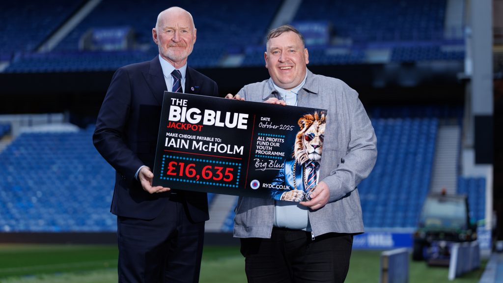 Congratulations to Rangers fan Iain McHolm who won our first Big Blue Jackpot prize of £16,635. 9-in-a-Row legend John Brown presented the lifelong bluenose with his cheque at Ibrox.