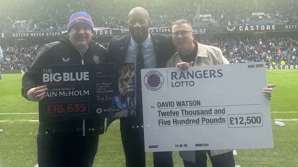 Lifelong bluenoses Iain McHolm and David Watson joined former Ibrox star Marvin Andrews on the pitch at half-time on Saturday as both men celebrated winning big money by playing Rangers Lotto.