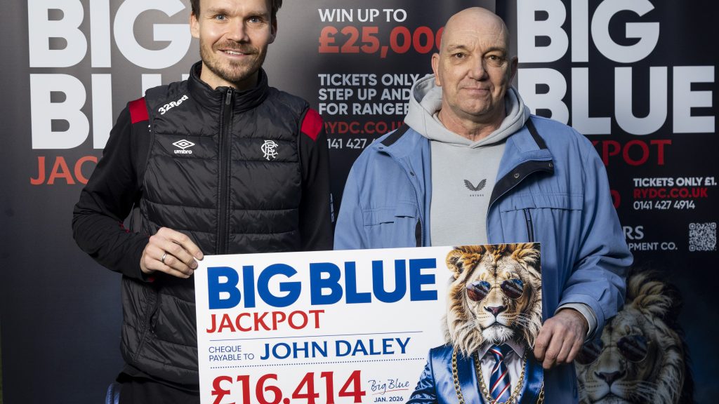Lifelong Rangers fan John Daley was presented with a Big Blue Jackpot prize of £16,414 by Head Coach Danny Rohl recently and you can win big money just like him.