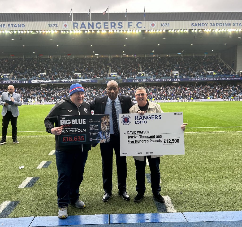Lifelong bluenoses Iain McHolm and David Watson joined former Ibrox star Marvin Andrews on the pitch at half-time on Saturday as both men celebrated winning big money by playing Rangers Lotto.