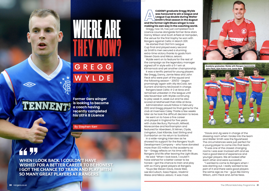 Academy graduate Gregg Wylde was honoured to win a League and League Cup double during Walter Smith’s final season in the dugout and the former Light Blues winger is now making his own way in the coaching world.